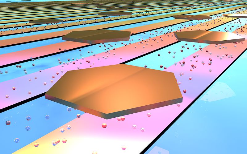 The stiction of Gold nanoflakes can be reversed by critical demixing (red and blue droplets) of a binary mixture near criticality. (c) Falko Schmidt