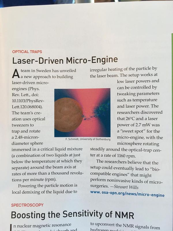 by Falko Schmidt, Alessandro Magazzù, Agnese Callegari, Luca Biancofiore, Frank Cichos & Giovanni Volpe, published in Physical Review Letters 120(6), 068004 (2018) has been featured in “Laser + Critical Liquid = Micro-Engine”, Optics & Photonics News (February 12, 2018)