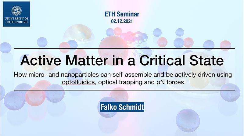 Falko Schmidt is talking about his research on Active matter in a critical state: How micro- and nanoparticles can self-assemble and be actively driven using optofluidics, optical trapping and pN forces at ETH Zurich at 16.00 on 02.12.2021.