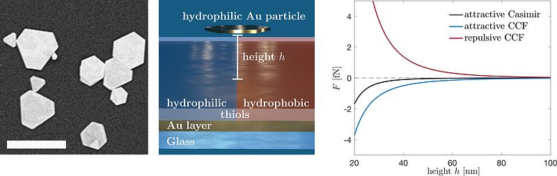 The distance between substrate and flake can be actively tuned via critical Casimir forces. Left: SEM image of the flakes. Middle: Illustration of experimental conditions on substrate functionality (red/blue). Right: Theoretical predictions of forces.