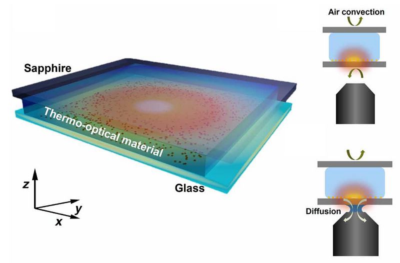 Schematics representing the phenomena of heat transfer in the microchamber when the chamber is probed using air-immersion and oil- immersion objectives, respectively, and its effect on the temporal evolution of the thermal profiles.