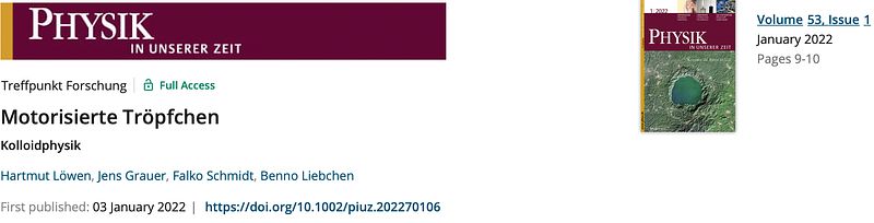 Löwen, H., Grauer, J., Schmidt, F., & Liebchen, B. (2022). Kolloidphysik: Motorisierte Tröpfchen. Physik in Unserer Zeit, 53(1), 9–10.